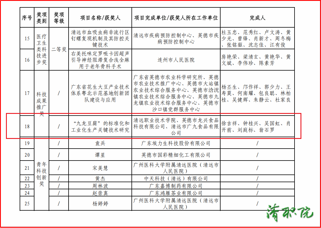 近日,2025年“创新清远”科学技术奖获奖成果及获奖人公布。清远职业技术学院徐吉祥博士主持的“九龙豆腐的标准化和工业化生产关键技术研究”项目荣获科技成果推广奖。